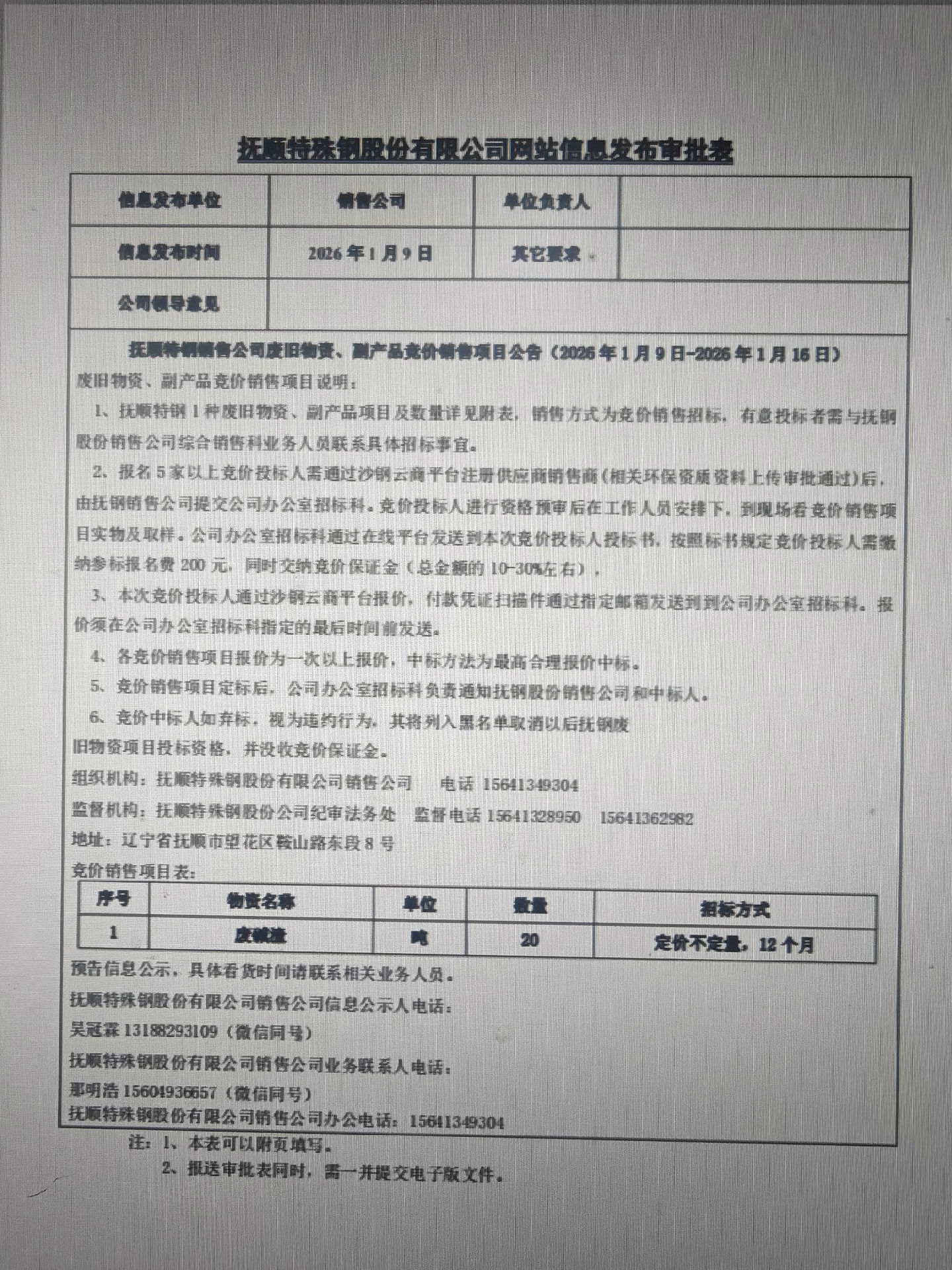 撫順特鋼銷(xiāo)售公司廢舊物資、副產(chǎn)品競(jìng)價(jià)銷(xiāo)售項(xiàng)目公告(1月9日-1月16日)